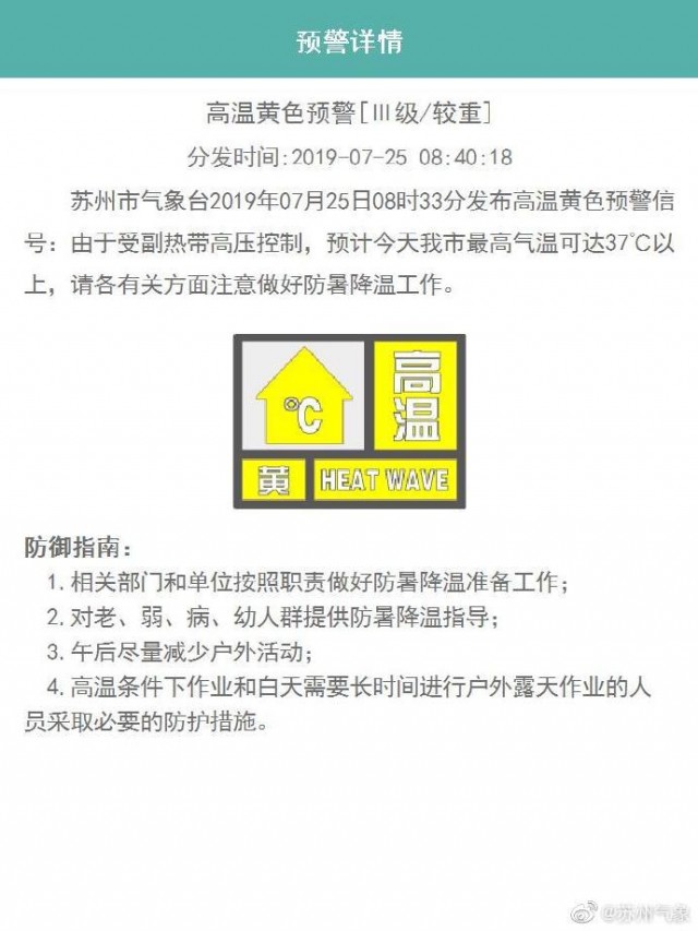 蘇州市氣象臺2019年07月25日08時33分發布高溫黃色預警信號:由于受副熱帶高壓控制,預計今天我市最高氣溫可達37℃以上,請各有關方面注意做好防暑降溫工作。