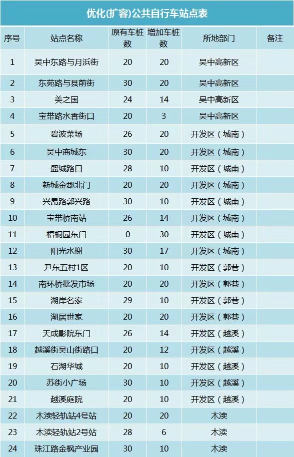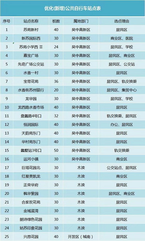 吳中區共建設站點504個、設車樁14320個、投放公共自行車12100輛,同時已更新車輛3200輛,各項數據均居全市前列。